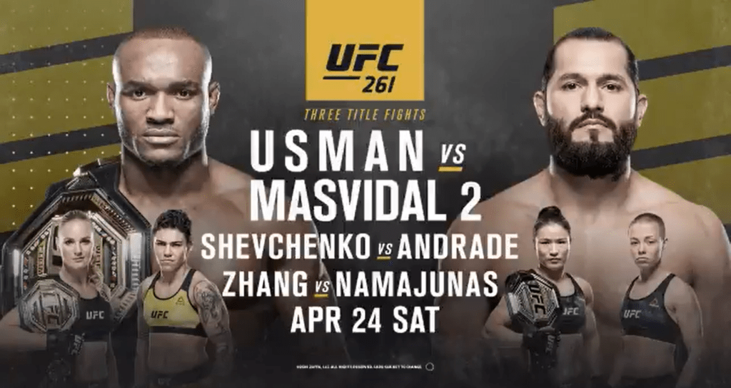 Then, topping off an action-packed UFC 261, UFC welterweight champion Kamaru Usman will return to the Octagon to defend his title against Jorge Masvidal for the second time in the span of less than nine months.